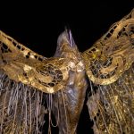 The sculpture is mounted on an old larch wooden base with the human form created in an artificial clay protruding from the base towards the sky with it’s wings created from fiber glass and epoxy resin covered with a real golden and bronze patina.