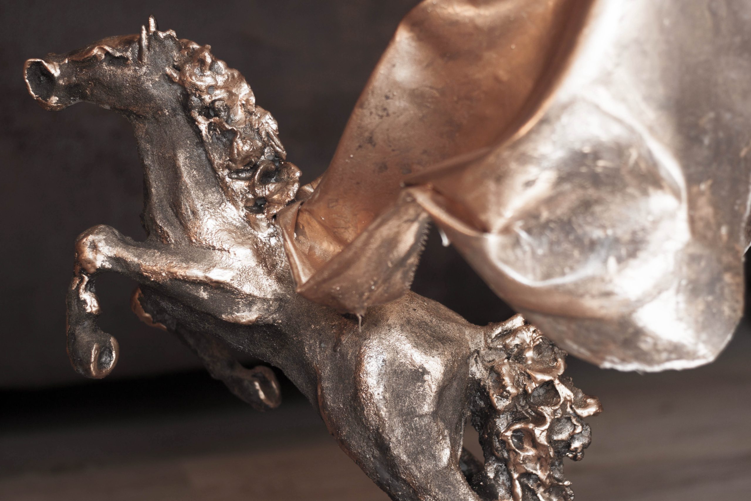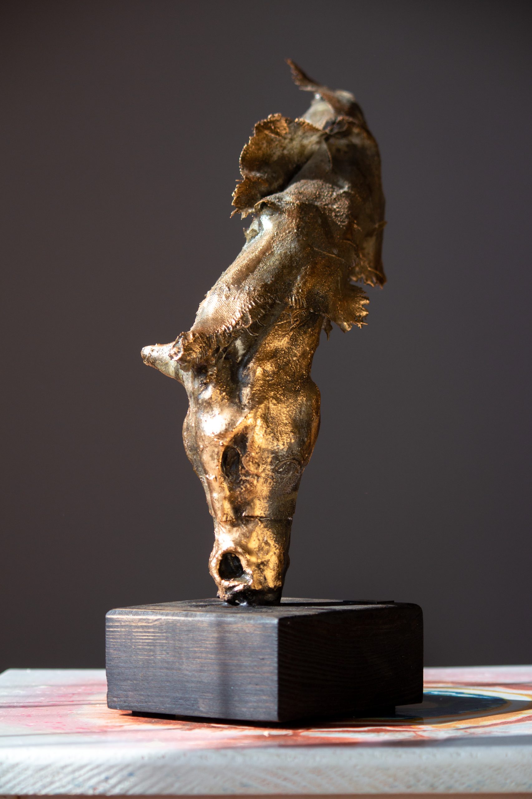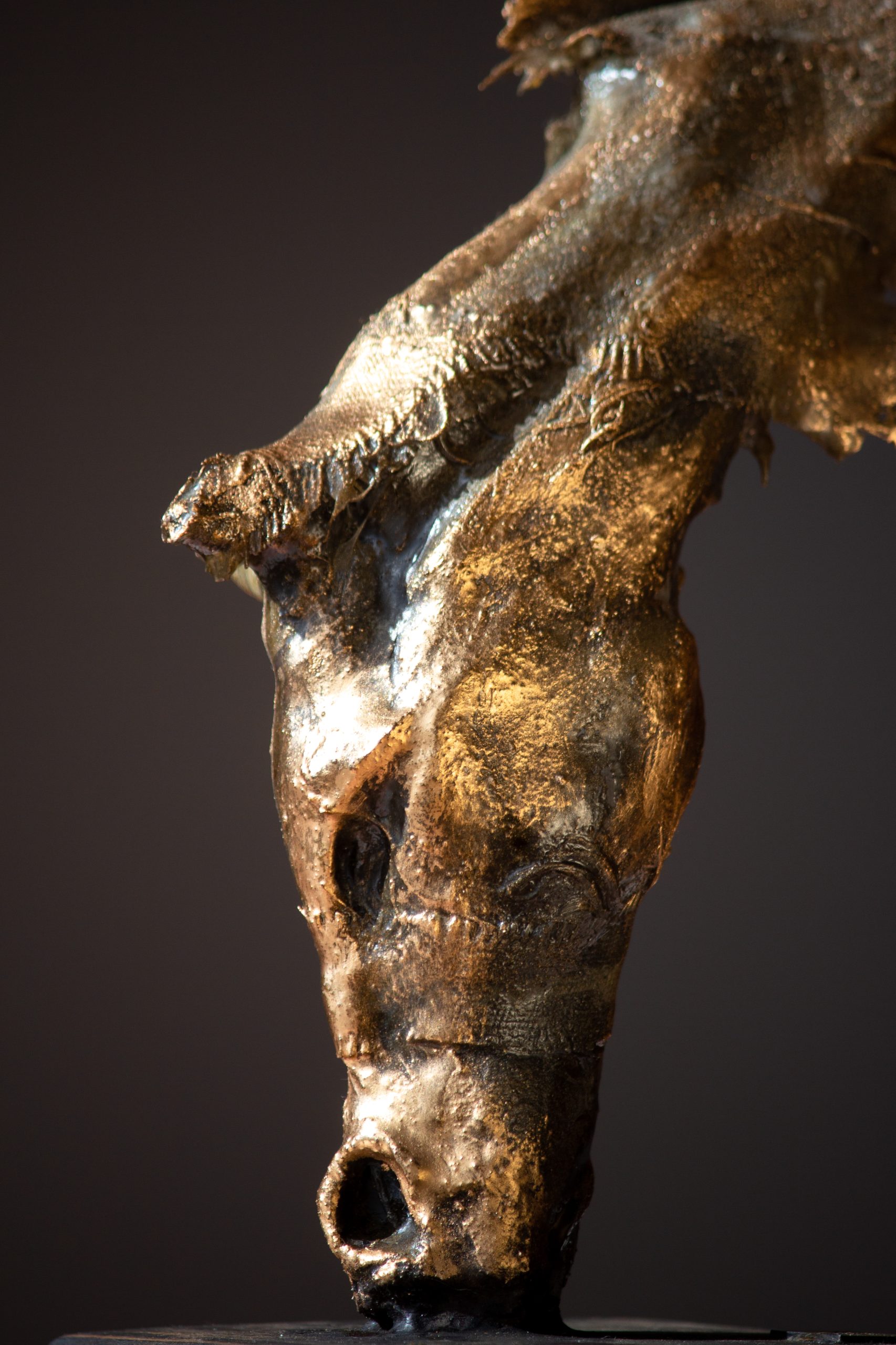 The majestic horse’s head of Orion honors our existence in the cosmos, as it represents the horse head nebula and our connection to everything around us. The sculpture is set on an old growth high mountain larch wooden base and is created of an artificial type clay, coated with epoxy resin and a final finish patina in real 24 carat gold.