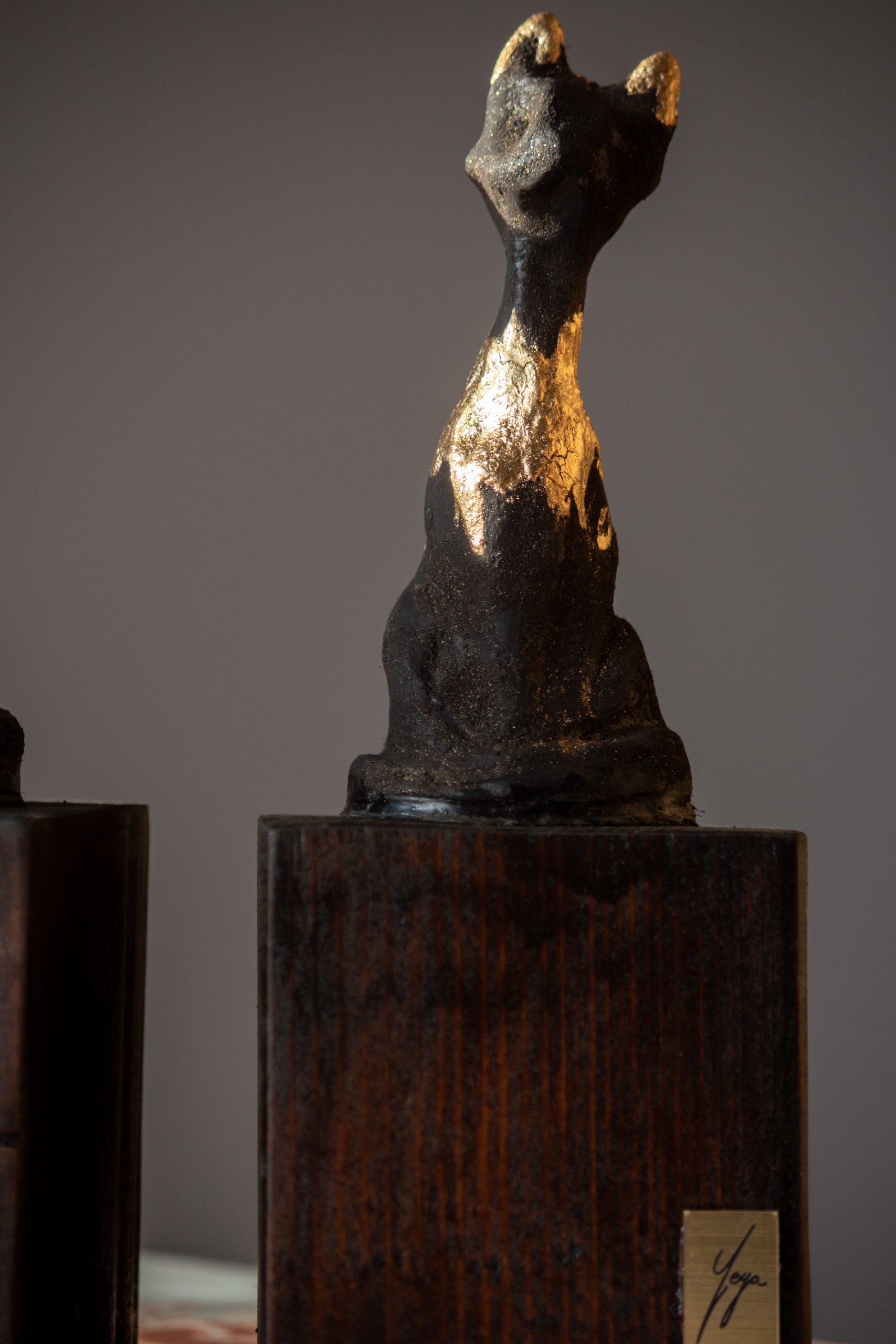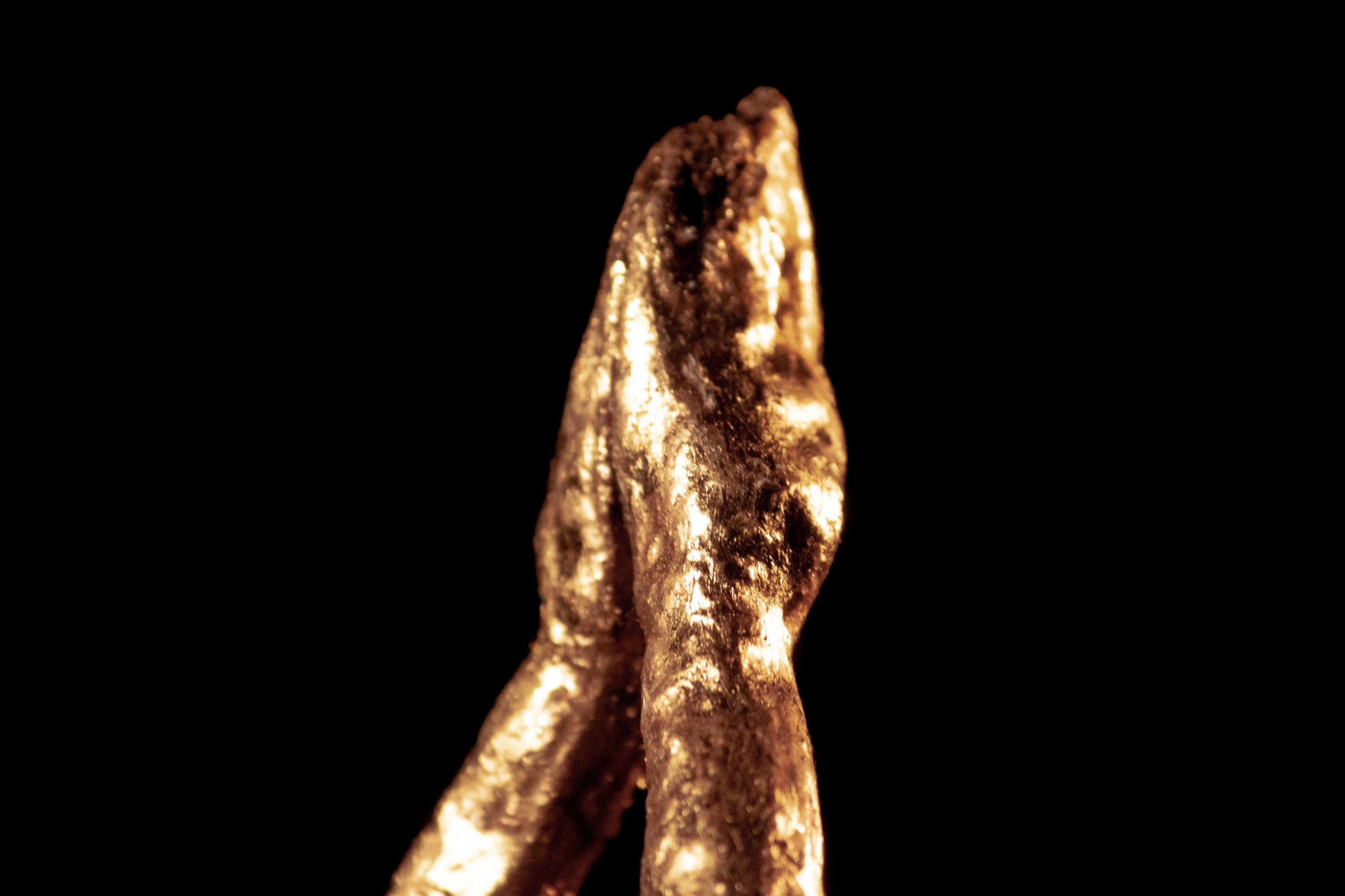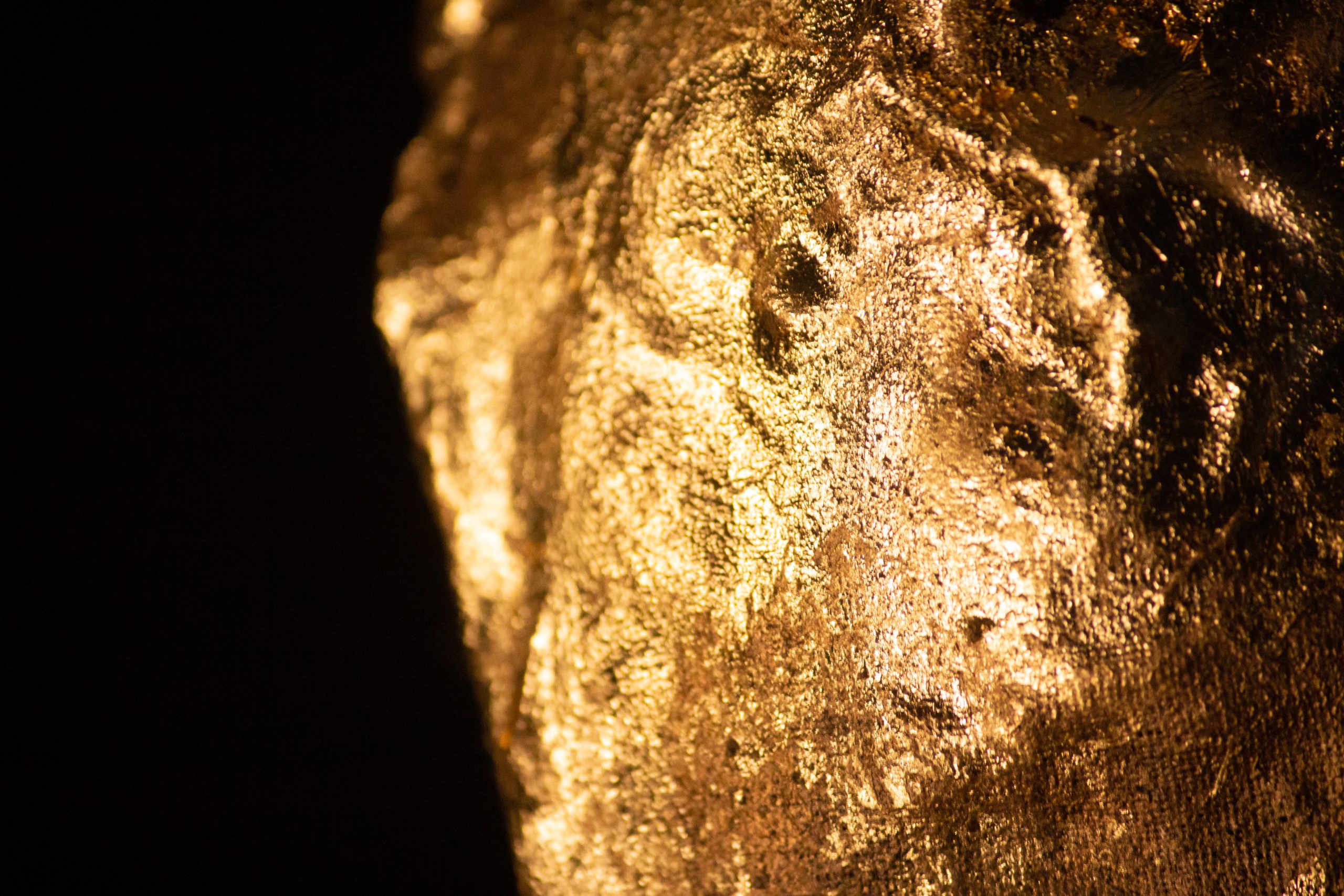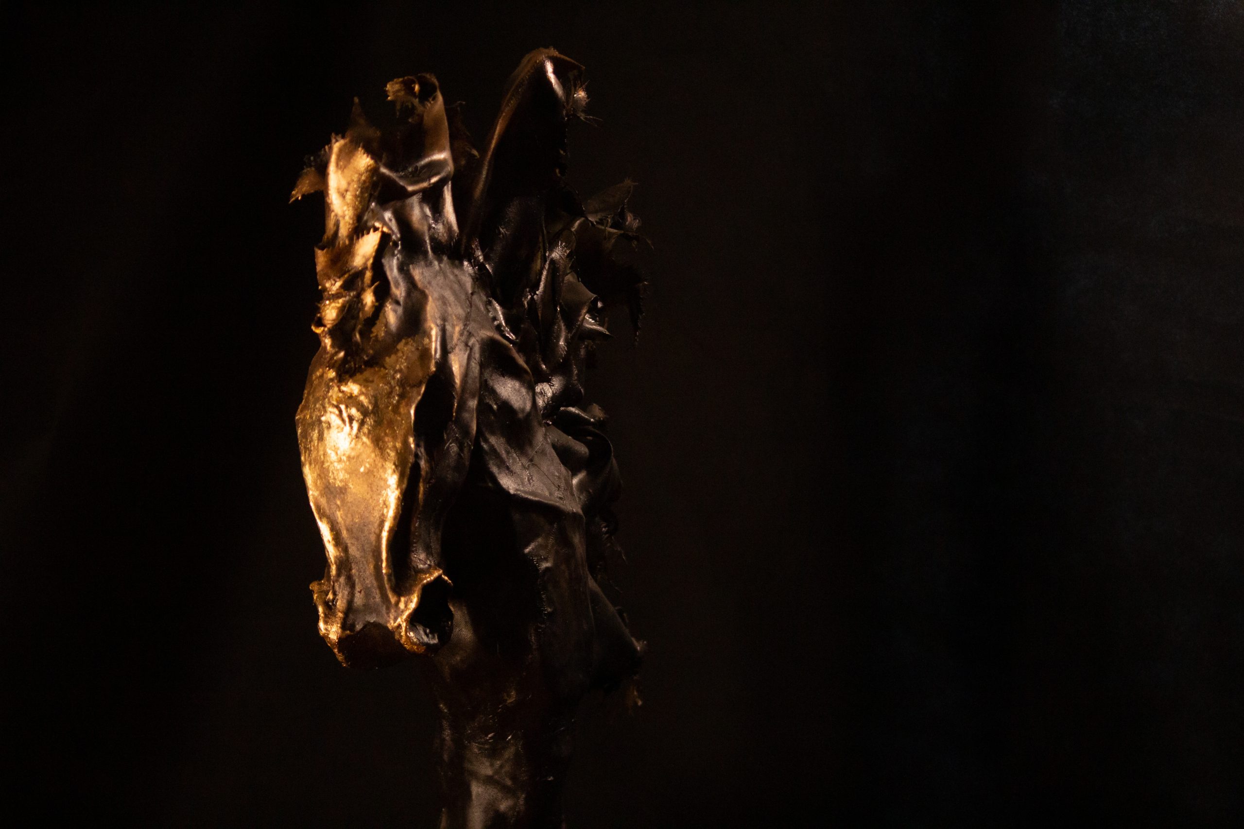 The majestic horse’s head of Orion honors our existence in the cosmos, as it represents the horse head nebula and our connection to everything around us. The sculpture is set on an old growth high mountain larch wooden base and is created of an artificial type clay, coated with epoxy resin and a final finish patina in real 24 carat gold.