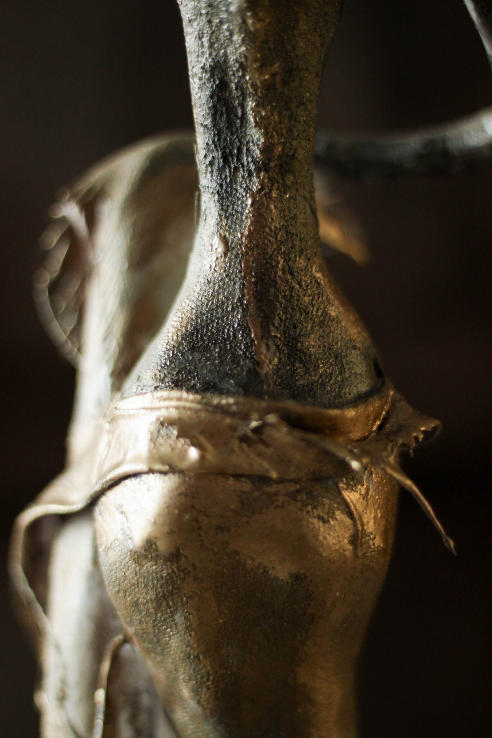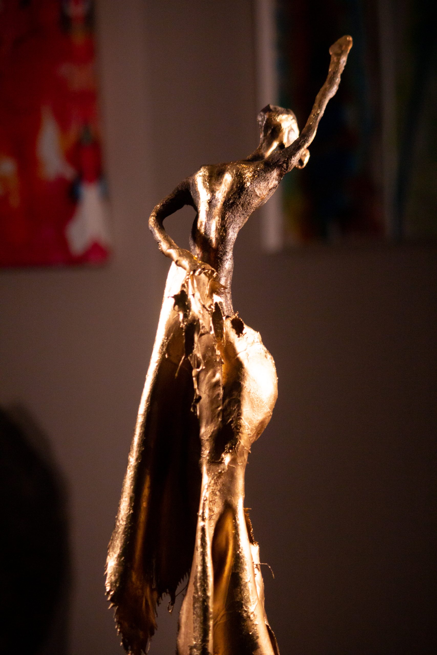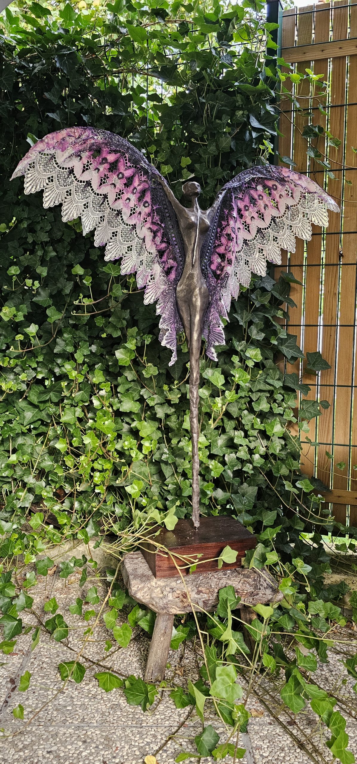The sculpture is mounted on an old larch wooden base with the human form created in an artificial clay protruding from the base towards the sky with it’s wings created from fiber glass and epoxy resin covered with a real golden and bronze patina.