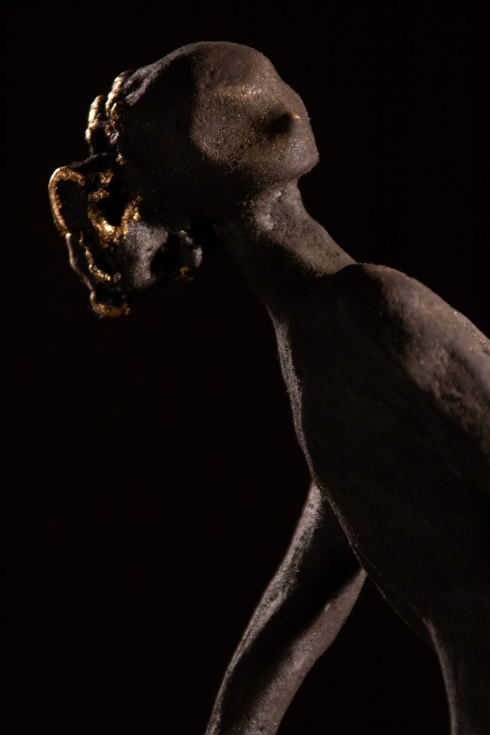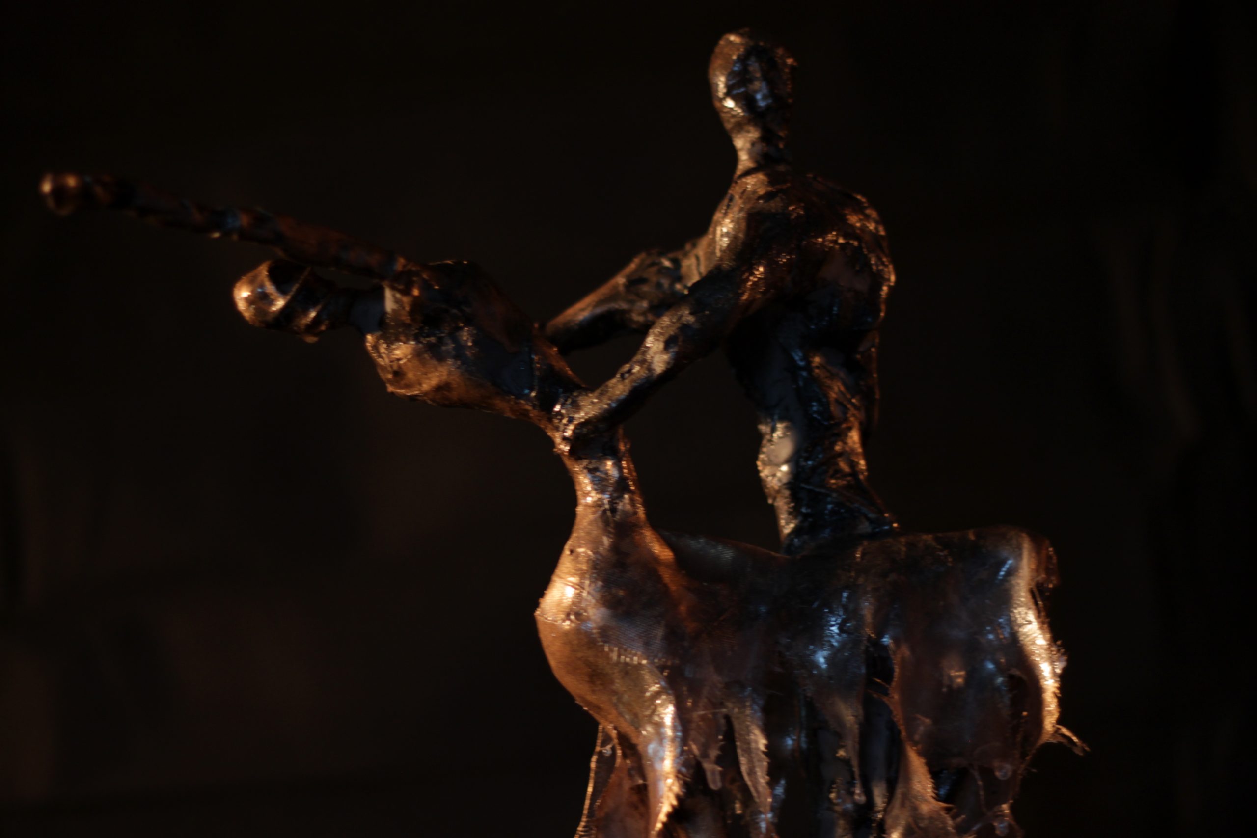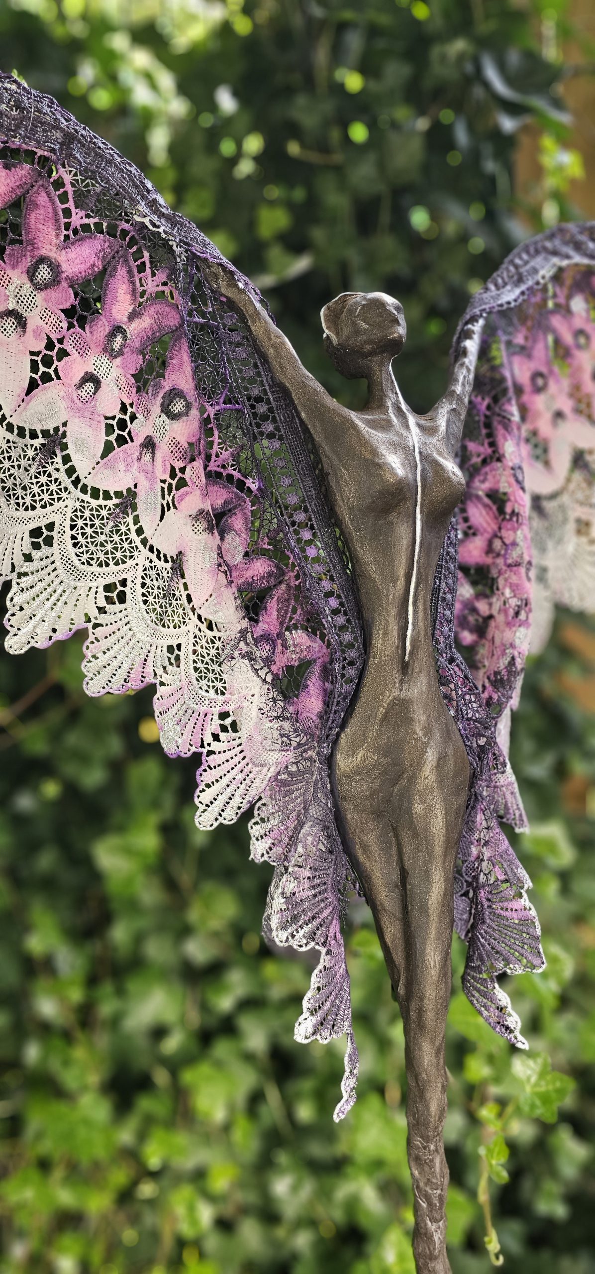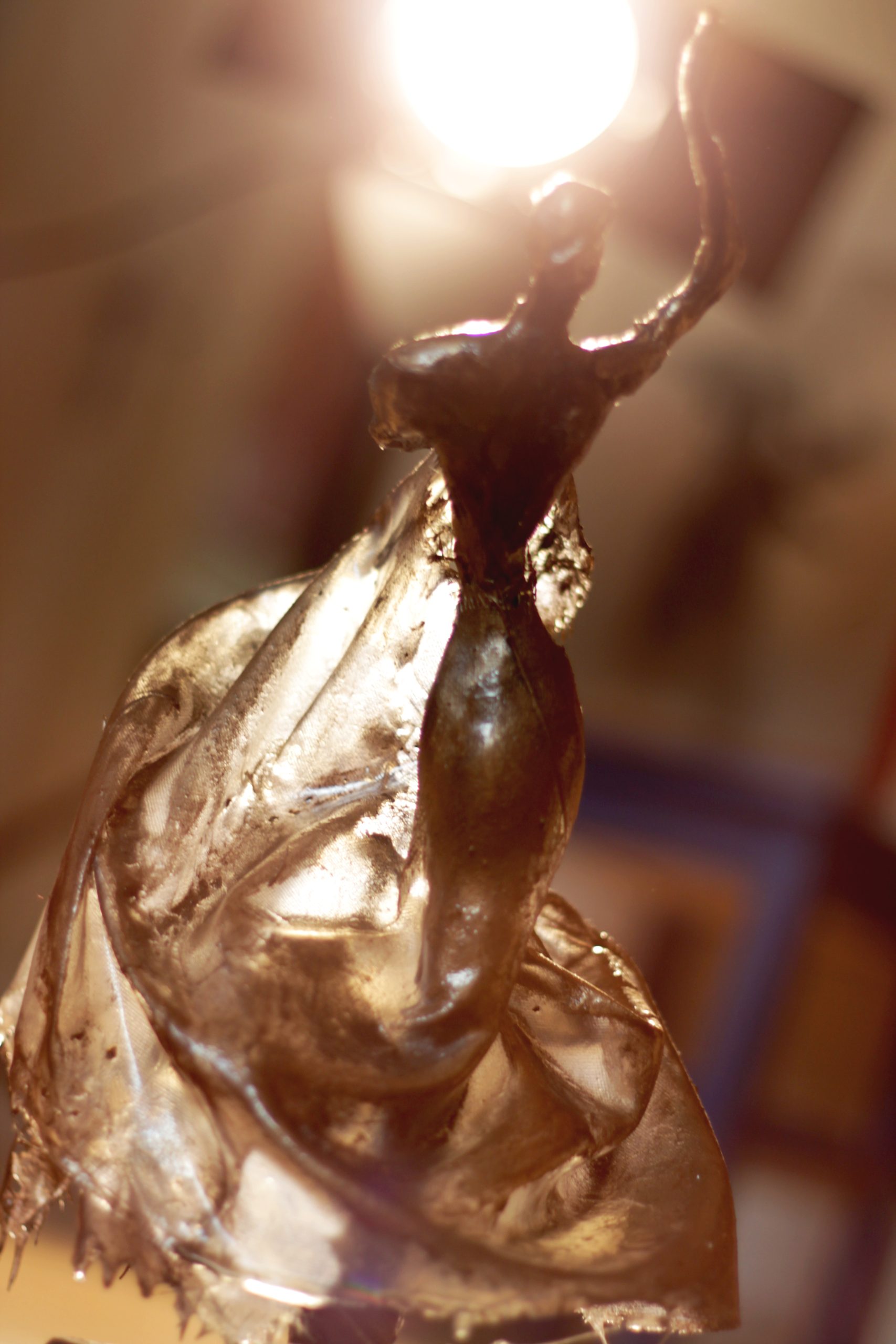 The sculpture is mounted on an old larch wooden base with the human form created in an artificial clay protruding from the base towards the sky with it’s wings created from fiber glass and epoxy resin covered with a real golden and bronze patina.