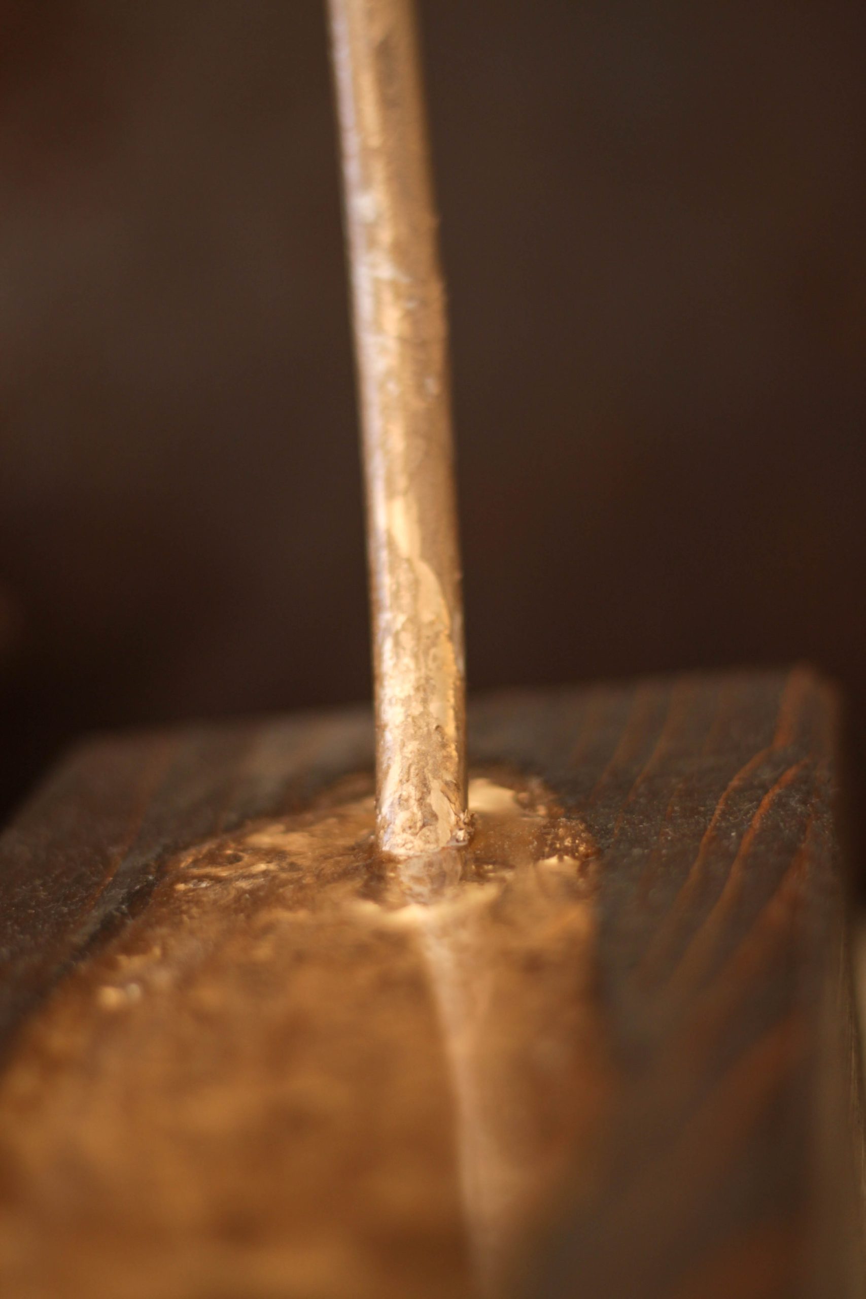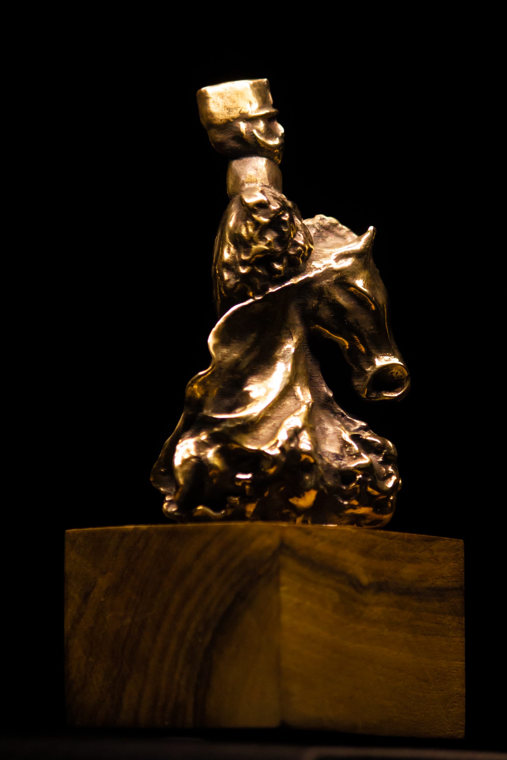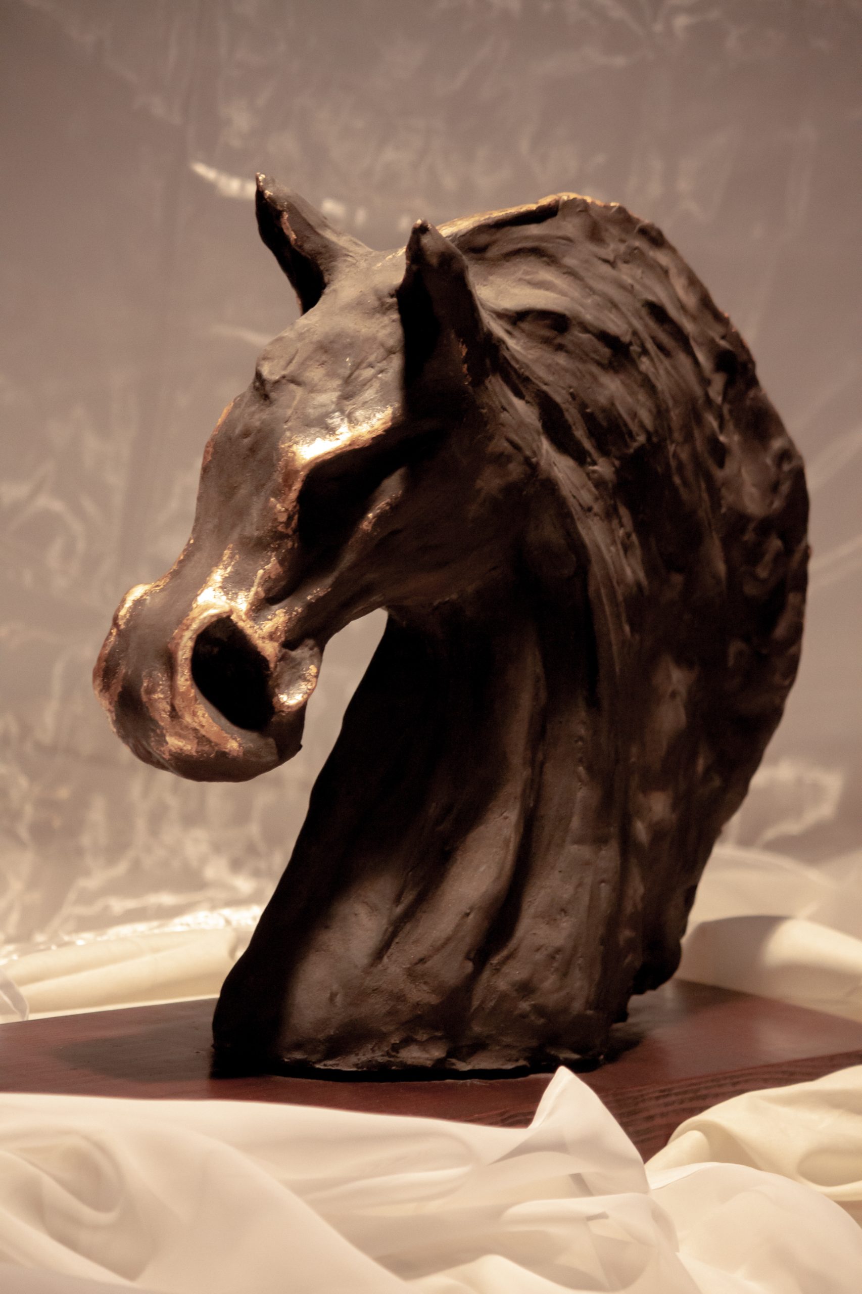 Large flaring nostrils and lush mane as well as the gold emphases that form his shape slowly disappear into the vertical wooden base of the sculpture.