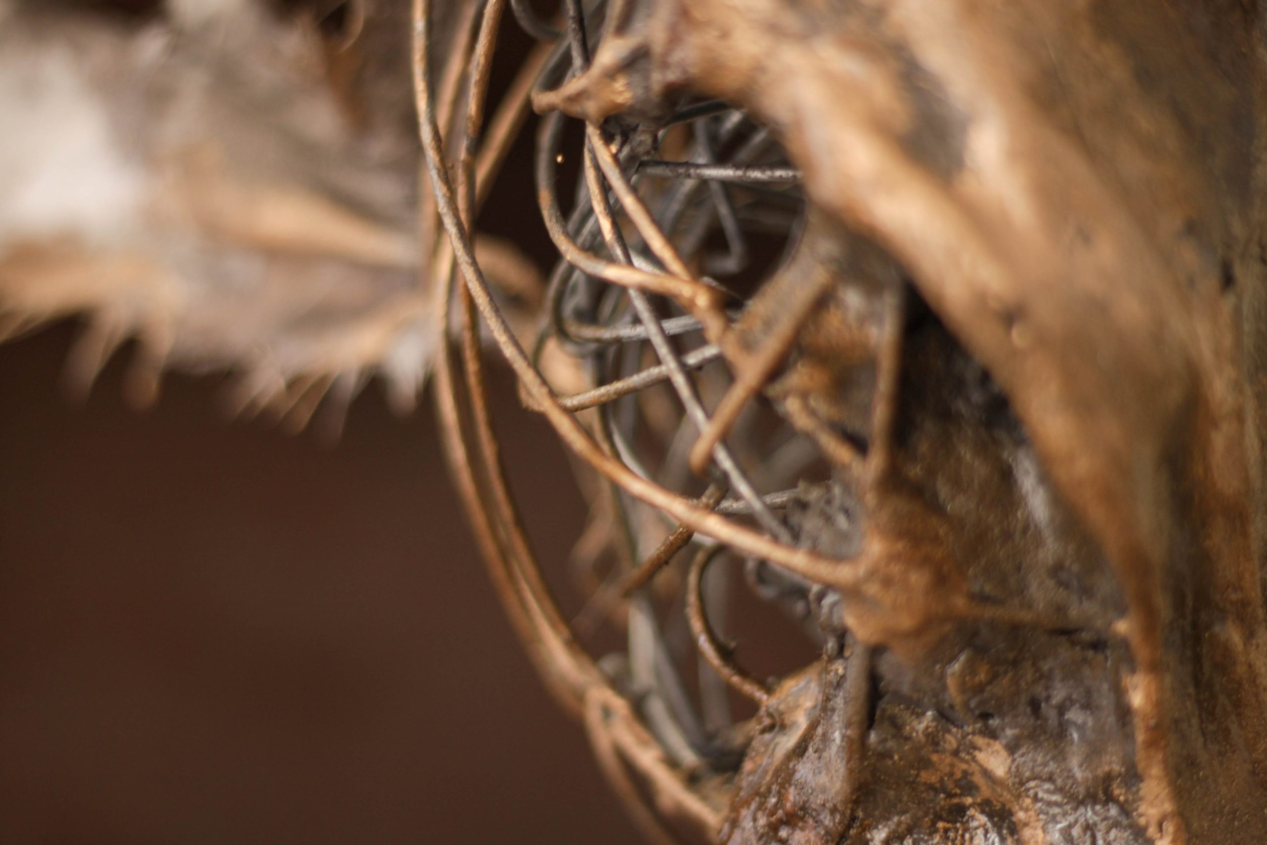 Mini Mistique is a horse who’s name even suggests that it is mystical, mighty and magical. The sculpture is depicting a horses head in an unusual posture where the head is facing downward. The sculpture begins with a wooden base at the bottom and then continues upwards with the horses muzzle and then with the head where it’s mane slowly disperses into empty space adding a mystical quality to the sculpture where the light plays and shows the sculpture going from realism to abstract. The base of the sculpture is a very old railroad track beam adding to it’s mysticism.