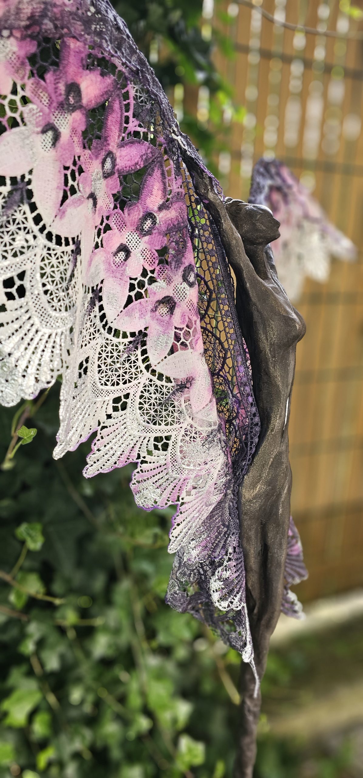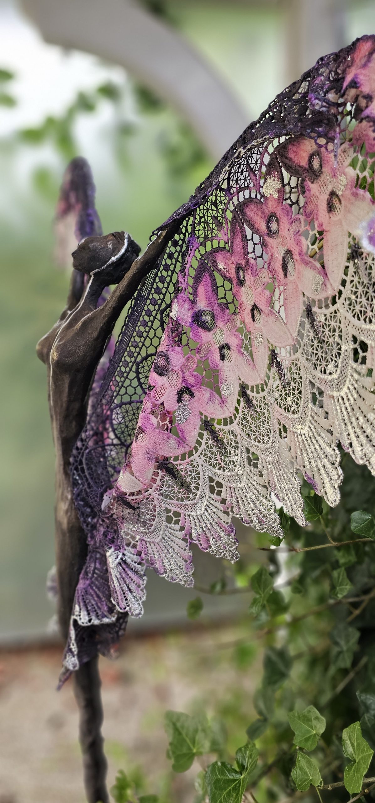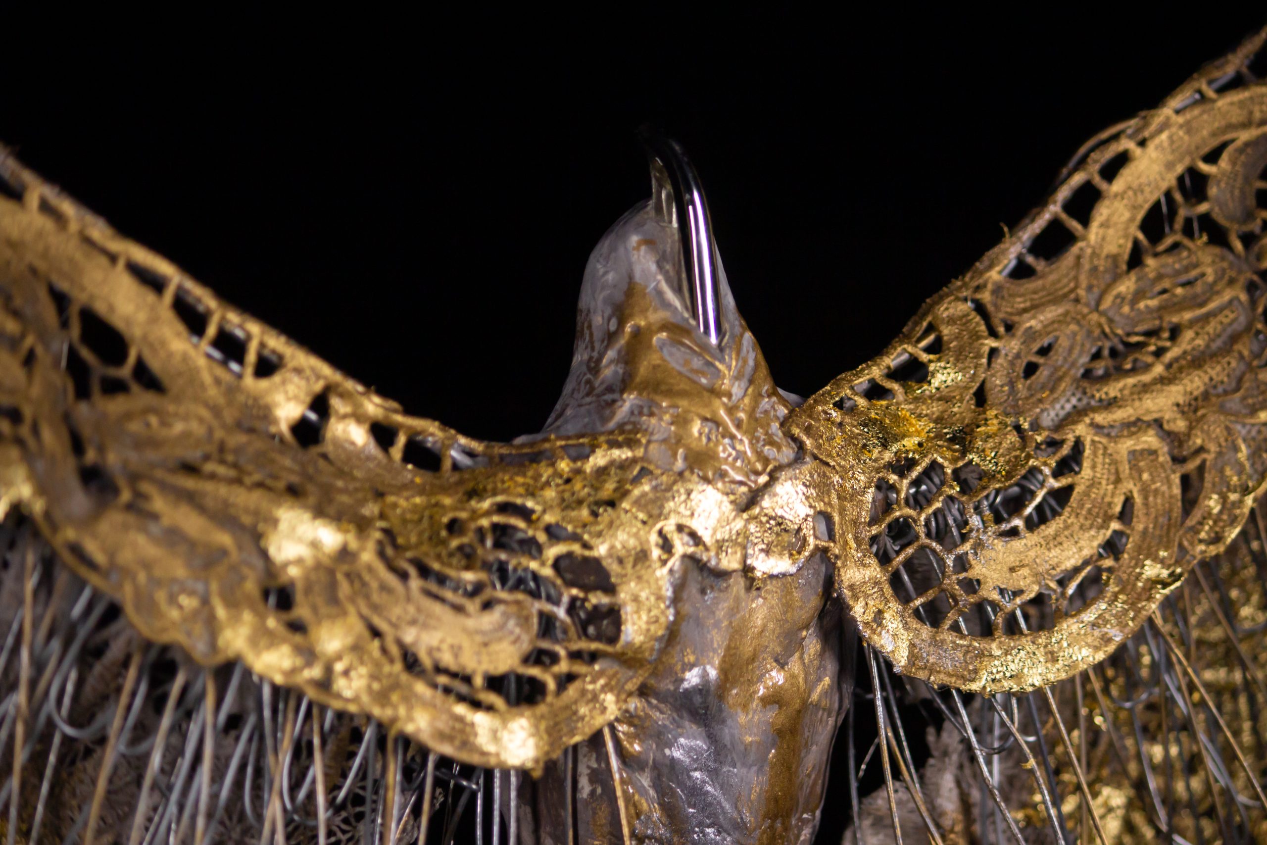 The sculpture is made from an artificial type of clay and finished with transparent fibers, textiles, and epoxy. The patina is created from real ground bronze alloy, patinated and with silver leaf. The use of materials gives the sculpture a metallic appearance, while the use of transparent parts creates a sense of lightness. The entire sculpture rests