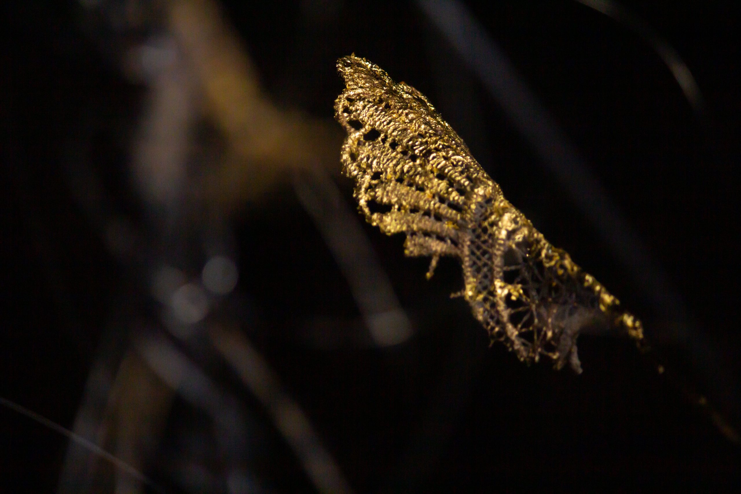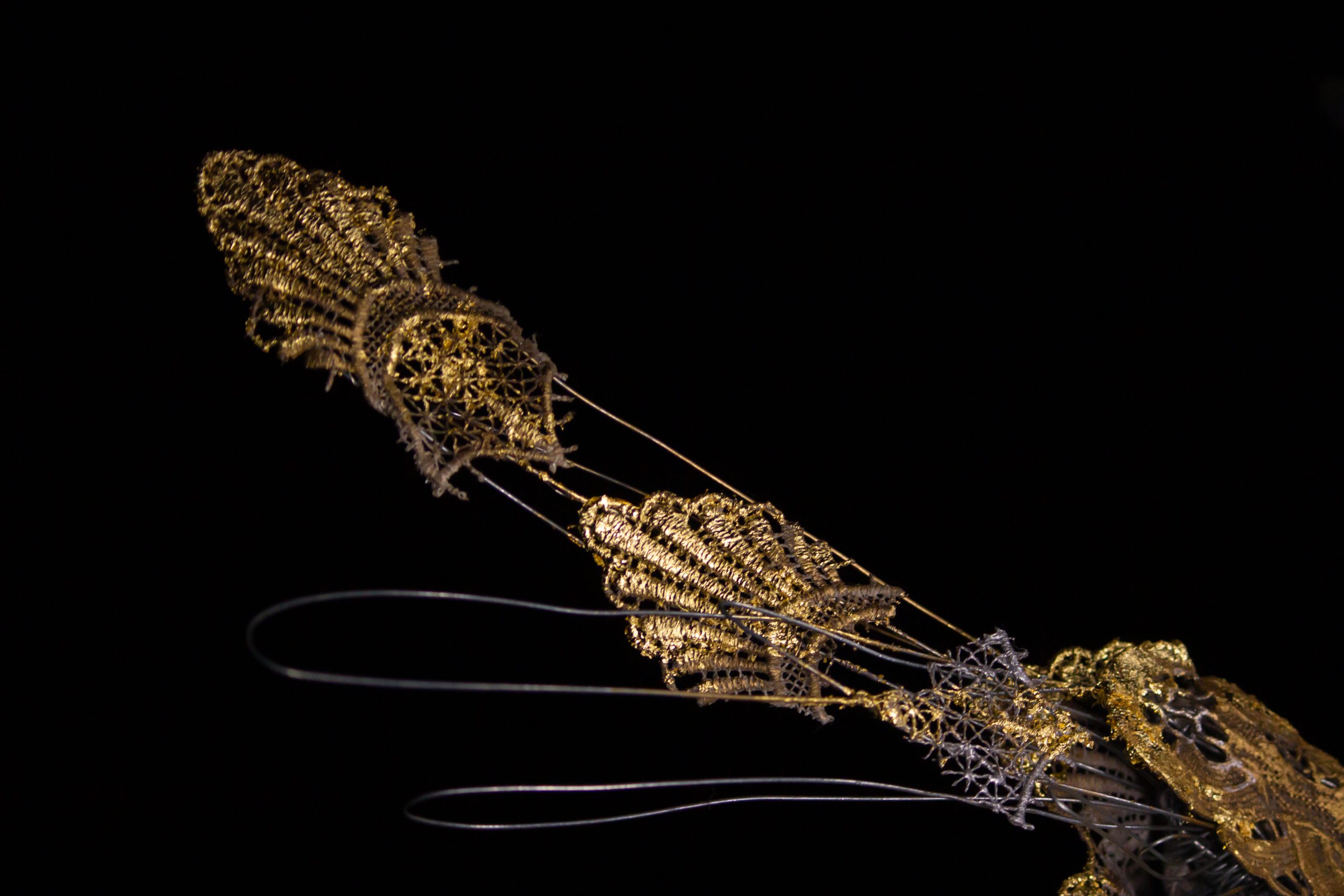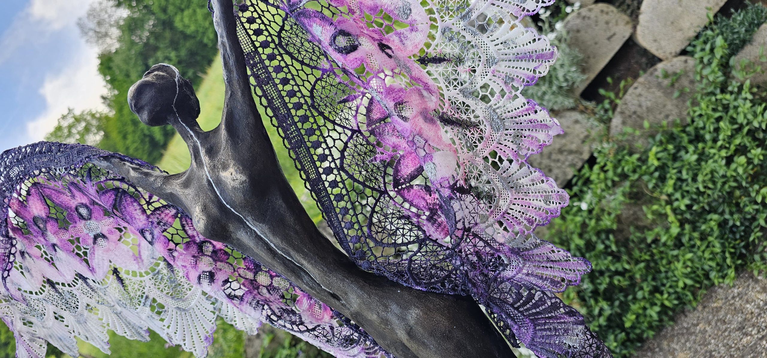 The sculpture is made from an artificial type of clay and finished with transparent fibers, textiles, and epoxy. The patina is created from real ground bronze alloy, patinated and with silver leaf. The use of materials gives the sculpture a metallic appearance, while the use of transparent parts creates a sense of lightness. The entire sculpture rests